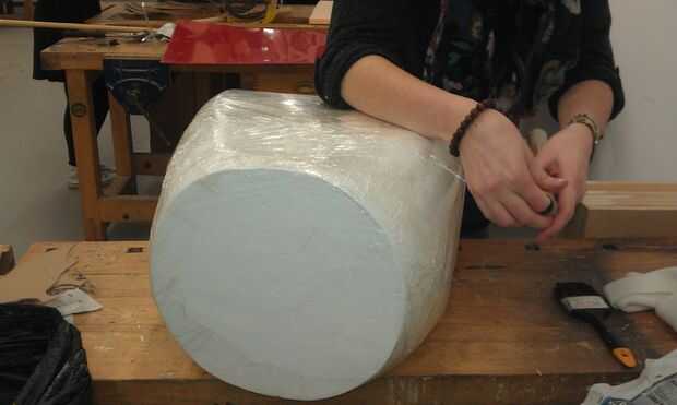 Tenemos que crear una superficie lisa como sea posible para asegurarse de que el interior de nuestros conductos produce turbulencia mínima. La forma más sencilla de hacerlo es ir alrededor de la circunferencia con film transparente una vez, se superponen los bordes, luego la película y comenzar de nuevo más alto hasta que se cubre la forma entera (incluyendo las superficies superior e inferior). Esta técnica impide que las ondas que aparecen en la película cuando usted intenta y cubre la forma de una sola vez.