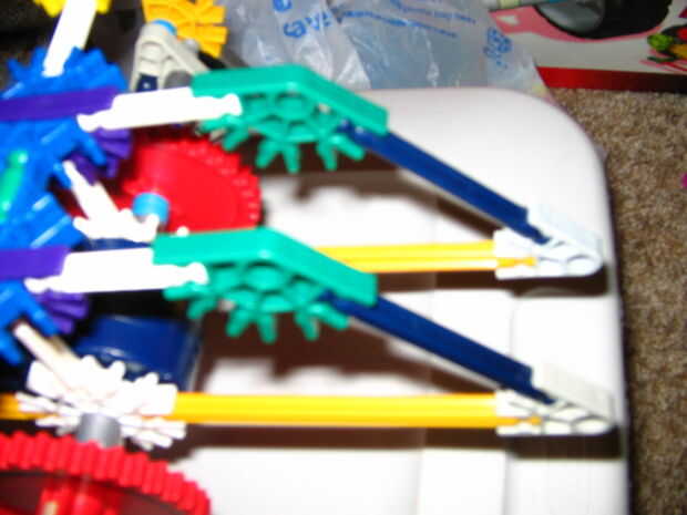 utiliza k'nex todos excepto el perno usado para conectar la cámara a la k'nex. Vean mi video de youtube sobre cómo hacerlo y usarlo.Paso 1: Construir la Base Conecte 2 conectores azules o negros con una barra blanca y añadir 2 conectores de media lun