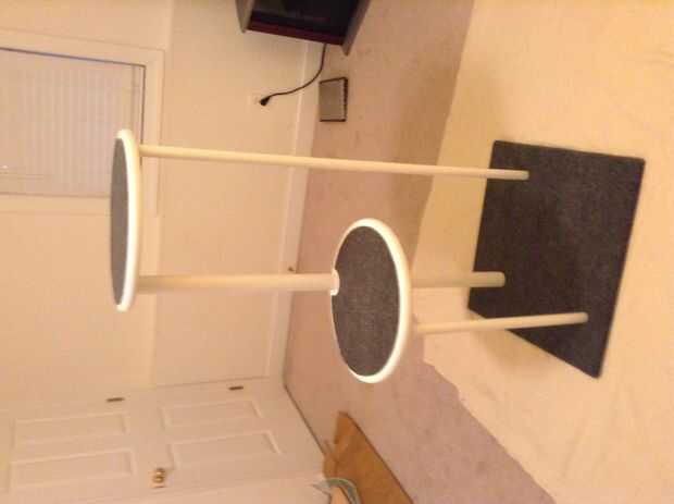 Este árbol del gato consta de un mueble viejo (gratis), un tubo de alfombra (gratis), césped artificial (donado por un amigo) y 3 x 'Sindal' alfombra de Ikea (£3 cada uno).El árbol fue hecho durante un fin de semana y ofrece juegos y diversión sin fi