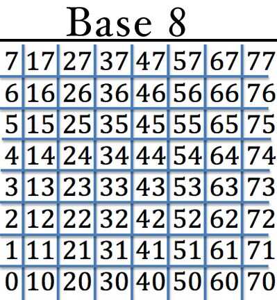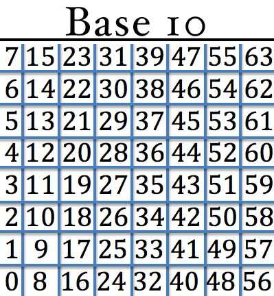 Para resolver este problema, tome el número 10 de base de cada plaza y convertirlo a la base 8 utilizando el operador módulo en C. 27, por ejemplo, es el 33 en base 8, con el primer dígito es la coordenada x y la segunda la y. Si se cuenta en tres plazas y hasta tres plazas, voila! Usted termina en la Plaza 27. Este sistema de coordenadas se termina pareciendo a la imagen #4.