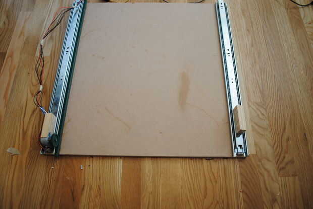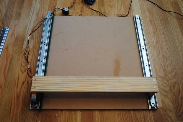 A continuación, cortar dos tiras 2' de 1 "x 2" de madera y montar los bloques con tornillos para madera. Asegúrese de que los tornillos están apretados, o los rodamientos no pueden mover al mismo tiempo. Se podría considerar la adición de madera-pegamento para bloquearlas más firmemente en su lugar. Estas barras necesitan ser lo suficientemente grande como para apoyar nuestro cojinete de eje de X, queremos utilizar la menor cantidad posible para evitar peso innecesario. Si el entero X Asamblea pesa demasiado, nuestro motor de pasos del eje Y no tiene suficiente torque para mover eficientemente, o si es muy pesado, en todo.