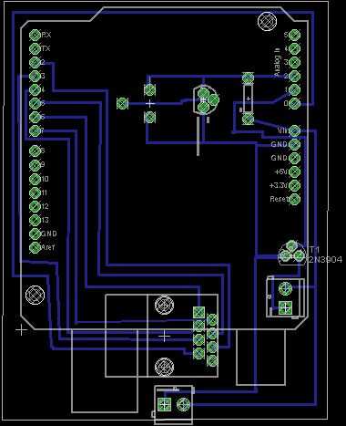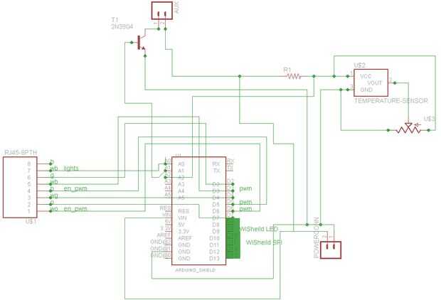 Uso de biblioteca de parte de águila de SparkFun que diseñé un escudo Arduino que pase los pernos a la pantalla de Wi-Fi y conectar a la pantalla controlador de motor vía el conector RJ45 y 2 bornes de tornillo.
