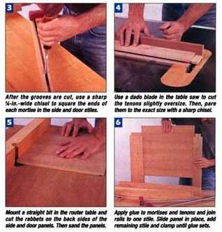 Equipar a la Sierra de mesa con un disco de moldurar para cortar las espigas del carril y utilice un stopblock al calibre de ingletes para colocar los rieles (foto 4). Para la mejor articulación del pegamento, corte las espigas sobre 1⁄32 pulg más gruesa que el especificado. Después de ocupar los carriles en el borde para cortar los hombros de la espiga, utilice un cincel afilado a pare las espigas a la medida exacta. Utilizamos chapa de la cereza de 1⁄2 pulg MDF (fibra de densidad media) para los paneles. Aunque puede utilizar madera contrachapada de la chapa de la cereza en su lugar, la estabilidad y la llanura de MDF hacen una mejor opción. Cortar los paneles a la medida y una mesa de fresadora para el rebaje en el interior de la forma superficial de cada uno (Foto 5). Arena cada panel con 120, 150, 180 y 220-grano.