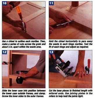 Es más fácil cortar las mortajas de bisagra en los marcos laterales de caja antes de ensamblar los casos. Usar un gramil y la plaza para marcar el contorno de cada mortaja. Luego, realizar una serie de cortes paralelos de cincel a lo largo de la mortaja apenas tímido de la profundidad final (foto 10). Sujetar el cincel horizontalmente que pare a los residuos (foto 11), y prueba de ajustar cada bisagra para ver que quede alineada.