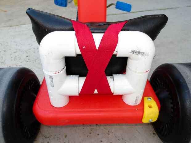 O cualquier otro tipo de material de "almohada" como usted puede tener a mano. Ya nos habíamos hecho a mano una almohada para el asiento original que atados con elástico y simplemente reutiliza lo aquí (boca abajo).