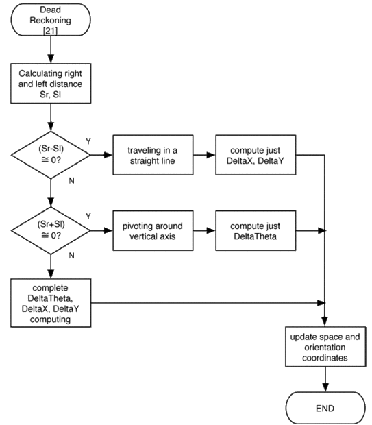Para evitar errores computacionales (dividir por cero) y residuos de la época de controlador, un cheque se tiene que hacer de antemano sobre las variables Sr y Sl. Definición de un cuasi-cero valor de mínima aproximaciones computacionales y mecánicas nos podemos simplificar las fórmulas si el robot está viajando en línea recta (el espacio que ocupa la rueda derecha es casi lo mismo que el espacio recorrido por la rueda izquierda) o si está girando alrededor de su eje vertical (el espacio que ocupa la rueda derecha es casi lo mismo que el espacio recorrido por la rueda izquierda pero en una dirección opuesta) , como indica en el diagrama de flujo se muestra en la última foto.