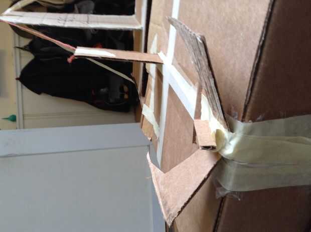 Opcional: Añadir dos pequeñas piezas rectangulares de cartón a las alas. Estos serán los flaps de las alas. (Estas aletas deben tienen una alta relación longitud a ancho y estar cerca de la mitad de la longitud de las alas). Las aletas pueden fijarse por pegar dos pedazos de cinta adhesiva cerca de los bordes de las aletas, perpendiculares a la costura de ala-aleta (ver imagen).