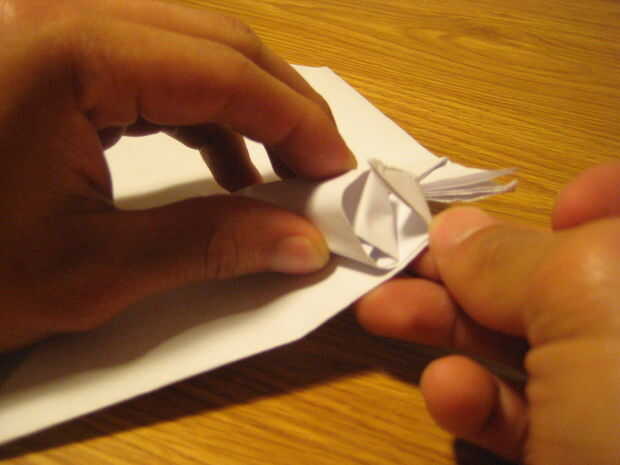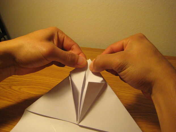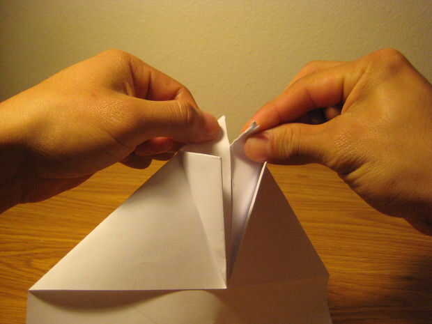 d. después, agarra uno de los triángulos rotos y meter la tapa en los bolsillos creados por el segundo pliegue de diamante como se muestra.