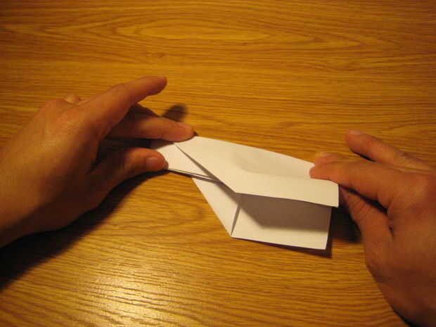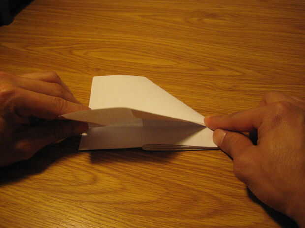 b. con el avión todavía en la posición de la doble de cuerpo, garb una de las alas y tire hacia abajo hasta el pliegue está justo sobre el pequeño triángulo.