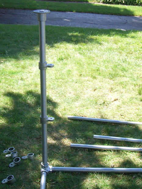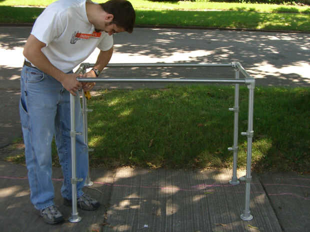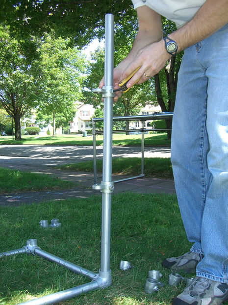 Nota: las piernas pueden estar inicialmente algo torcidas. Para rectificar esta punta el banco más por es piernas y ajustar el cómo ahora algunos de la tubería va en las guarniciones. Para ello aflojar y volver a apretar el tornillo de ajuste.