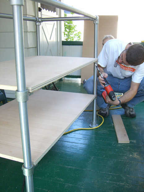 Para instalar los estantes simplemente colocar las tablas en el MH50s y cagué a lo largo de un tornillo (con una arandela en él). Si quieres hacerlo más fácil (que hicimos) puede inclinar la plataforma entera a su lado y tornillo de esa manera. Pre-taladrar los agujeros ayudará a la madera para evitar partir.