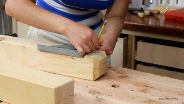 Empiezo con dos pulgadas desde la parte superior de las piernas de trazado. Esto es donde se unirá a la Junta. Así que primera línea encima de la madera y la primera parte va a ser hacia el interior en el Banco, por lo que estoy usando los tornillos exteriores para sujetar el cedro aquí.