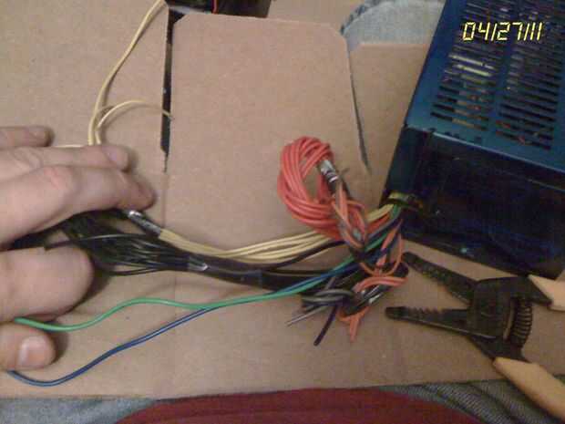 Para nuestros propósitos que he toman todo el extra los cables y los torcido para arriba en grupos para hacerlos más fuera del camino. Sólo necesitamos 4 conexiones; el GND (negro) por supuesto, el + 12 voltios (amarillo),-12 voltios de corriente continua (azul) y el verde del alambre. Elijo a liar juntos para simular un alambre más grande y permite algunos más corriente con menos calor por alambre. (Hice 2 terminales GND porque puse uno en el amplificador y el otro en el interruptor).