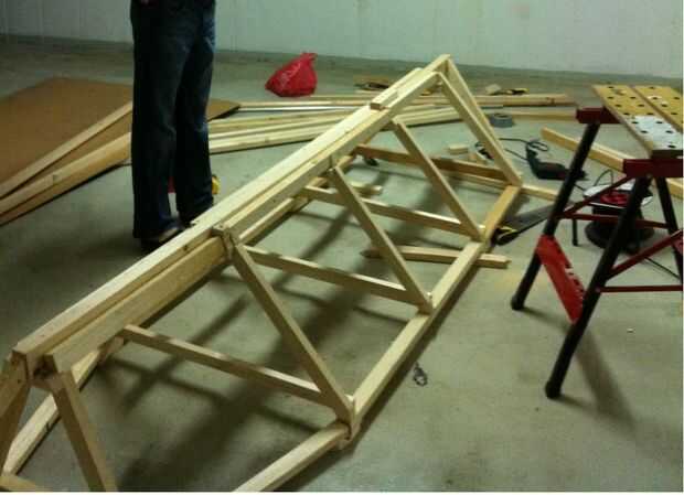 Después de la quilla, que algunos triángulos equiláteros de las vigas de madera (ver foto) pero no atornillar los triángulos todavía. Una vez que los triángulos, hacer la parte superior, unos 20-40cm (15.8 7.8 pulgadas) más largo que las otras 2 partes. Esta parte larga será atornillar los triángulos de la cara superior de su barco (la parte que mira hacia el cielo) y atornille hasta el fondo (la gruesa viga/quilla) del barco.