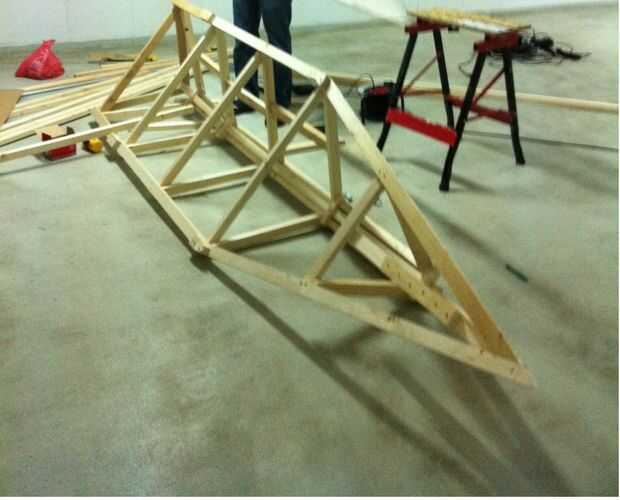 Ahora escoja un extremo para ser la punta del (el arco) agregar esloras de madera a cada esquina del triángulo final y vincularlos a las vigas de madera a nivel con la cubierta del barco (ver las fotos) la longitud de la madera procedente de la parte inferior de la embarcación (quilla) debe ser el más largo de los tres.