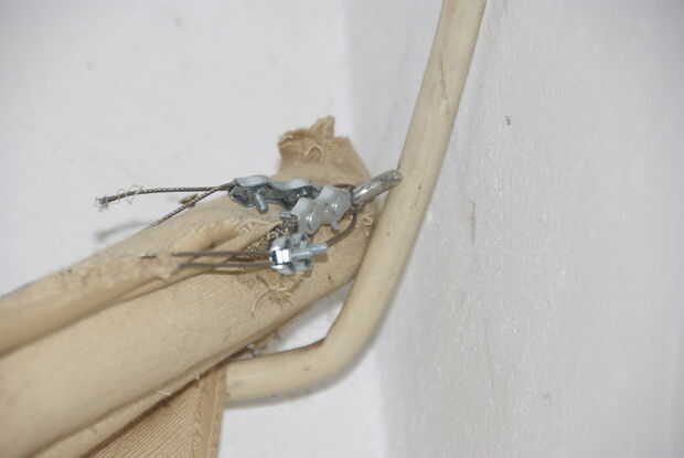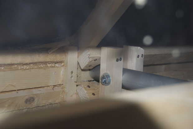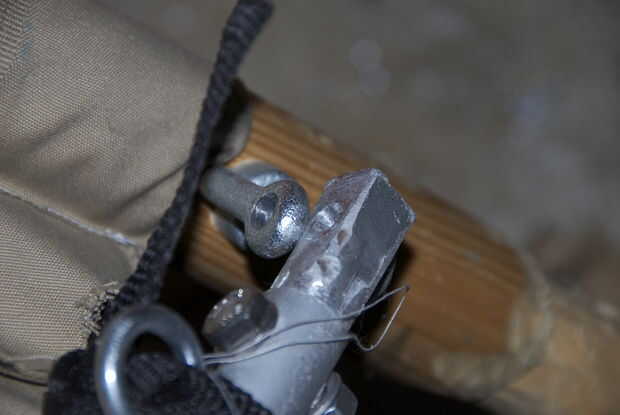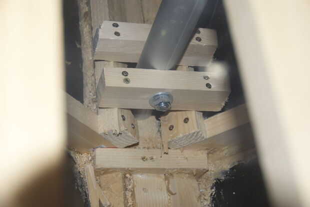 Ahora toma tu carril de madera y esculpir la parte inferior 20-40cm (7.8-15,8 en) de la misma por lo que lo encaja en la barra de aluminio (esto depende de la barra de aluminio tiene). Luego pégalo en. Ahora perfore 2 agujeros de 10cm de separación en la barra de aluminio y en la barra de madera al mismo tiempo. El agujero debe encajar una varilla de 12mm roscado. Pegan sus barras roscadas en y fijar con tuercas. Añadir un tornillo de lazo dirigido a la punta del mástil. Esto es para el cable.