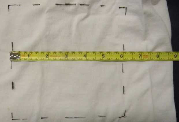 1.) Mida un cuadrado de 6 "x 6" en la camiseta o el material seleccionado y cuidadosamente corte con unas tijeras.