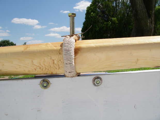 El diseño general de los toletes, como digo, se atribuye a Phil Bolger, aunque he leído referencias vagas a "pescadores" que más o menos pionero en les. nunca se sabe. De todos modos, son prácticamente sólo un bloque de madera a los lados con un tornillo y un trozo de cuerda para sujetar los remos. La cuerda debe tener un bucle en ambos extremos y para evitar que se desprenda utilicé una arandela de defensa cerca de la cabeza del perno. Los remos deben caber firmemente en los lazos de la cuerda, con suficiente holgura para que pueda girar, o plumas, como que de la fila. No importa si los remos están delante o detrás del bolt mientras rema, sin embargo, es mejor tenerlos detrás, donde como fila tensión sobre la cuerda, porque si necesita que se deje ir voy a girar y camino junto a la embarcación.