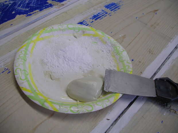 Mi primera mezcla fue probablly un poco demasiado pegajosa, pero que fijo que me decidí a recaulk todas las juntas por si acaso. Encontré que es un poco más fácil de mezclar en un recipiente poco profundo o un plato de papel. usted sabrá que es la consistencia derecha cuando usted puede rodar en una bola libremente pero si lo dejas sentarse en la mano que se pega.