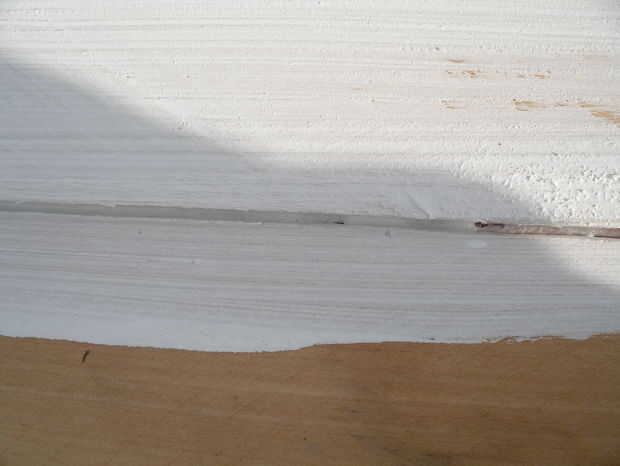 A continuación, todas las costuras deben ser masillado. Tradicionalmente es una mezcla de whiting (carbonato de calcio) y aceite de linaza o pitch simplemente hervida. Trato de sellador de techos, el material negro alquitrán-como. Yo, totalmente ignorante de todo esto en el momento de construcción, simplemente utilizar masilla de madera. Puedo todavía debe arrancar mi calafateo y comenzar de nuevo, ya veremos con el tiempo.