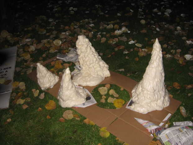 Cubrir sus estructuras en la espuma de expansión, siguiendo las indicaciones en las latas. Tu espuma puede deslizarse por sus estructuras y se acumulan en la parte inferior, asegúrese de establecer periódicos, cartón o ambos. Periódicos hará más fácil mover sus estalactitas más tarde, por lo recomiendo.