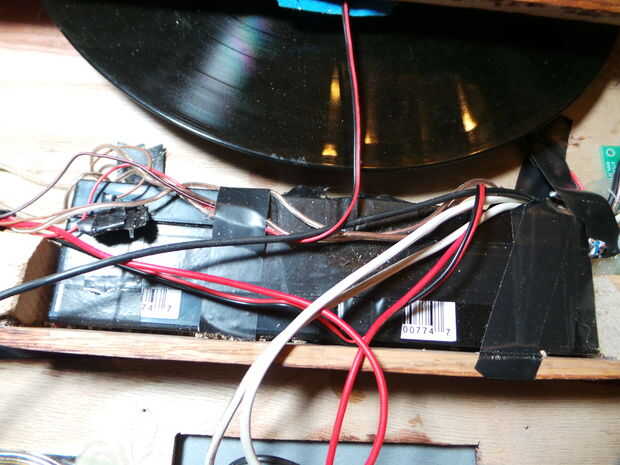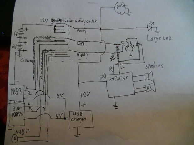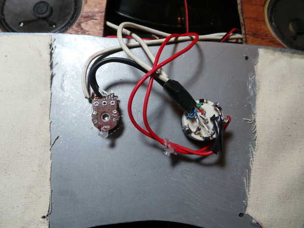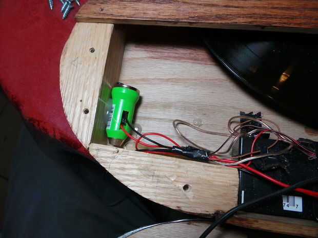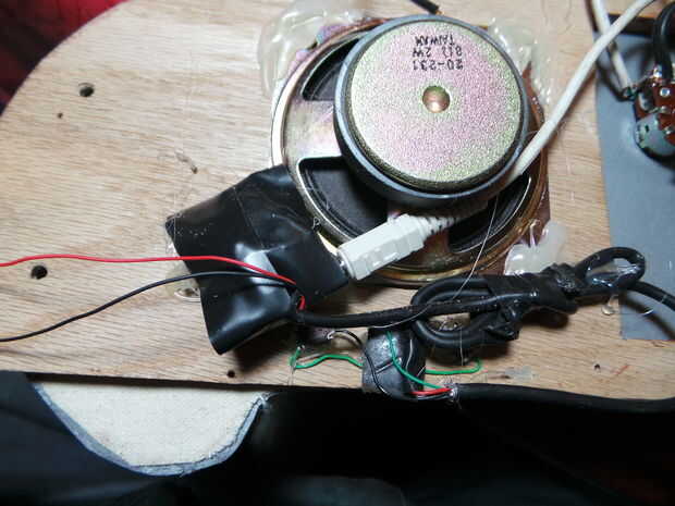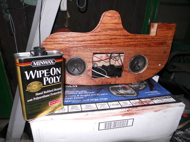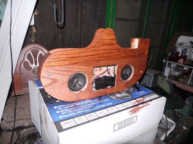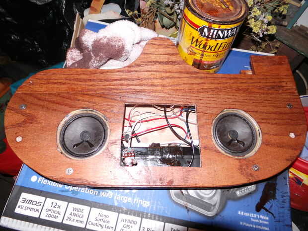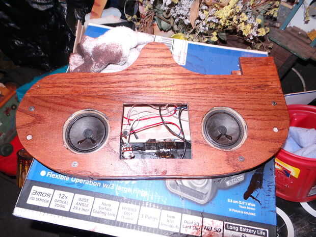 Después se realizó el lijado, cortar los agujeros en la parte delantera para altavoces y un panel de acceso en el centro. me caliente había pegado 3" ponentes lugar luego había montado en un amplificador de 3 vatios de DATAKIT nº 80-900. Usé 2 baterías recargables de 6v para todo y un cargador de usb verde $5 para alimentar un mp3 player y bluetooth receptor de energía.