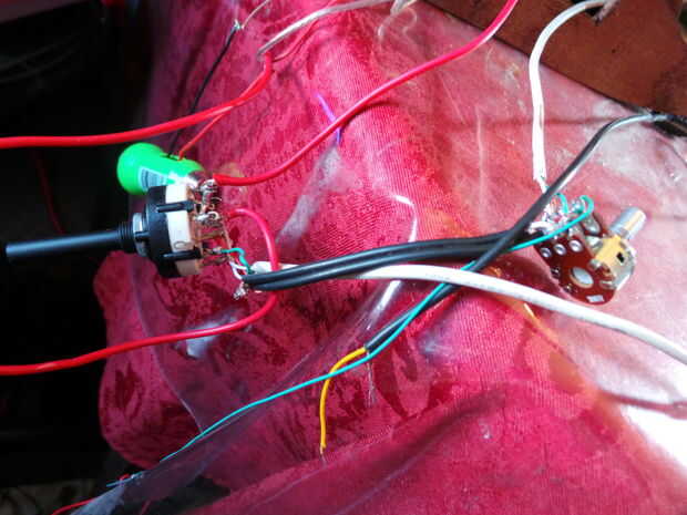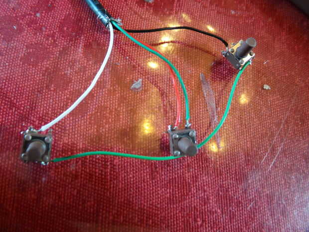 el reproductor de MP3 debe controlarse pero no quería que lo visible. me sacó las llaves y soldar un cable a rebobinar, reproducir/pausa y avance rápido. y 1 cable a tierra. en el otro extremo del cable que soldamos 3 llaves nuevas de un lado de cada tecla va a tierra y el otro va a los contactos para ff, rw o jugar. Luego perforé 3 agujeros por encima de los altavoces izquierdos por lo que estarían detrás de la tela del altavoz y todavía puede sentirlas con el dedo sin verlos.