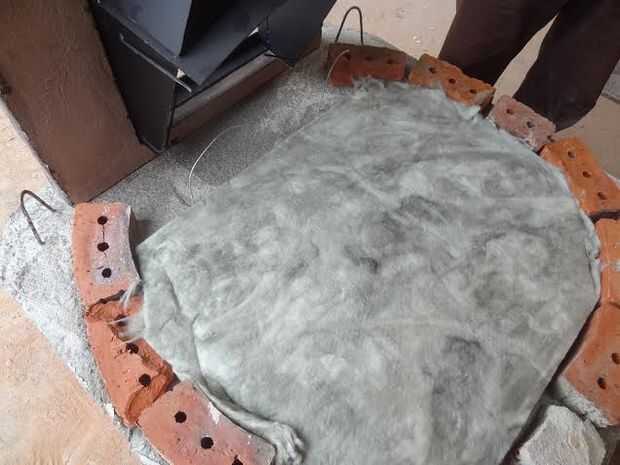 Cuando el cemento ha endurecido (mínimo 4-5 días) puede sacar su marco de madera. Coloque la primera capa de ladrillo de la arcilla como se muestra aquí. Añadir una capa de arena en el interior y luego lana mineral - East 2". Fibra de cerámica mejor y aun mejor tablero mineral rígido pero los 2 últimos elementos no están disponibles en Home Depot y son un poco costosos mientras que lana de roca es vendido por Home Depot y es más barato.