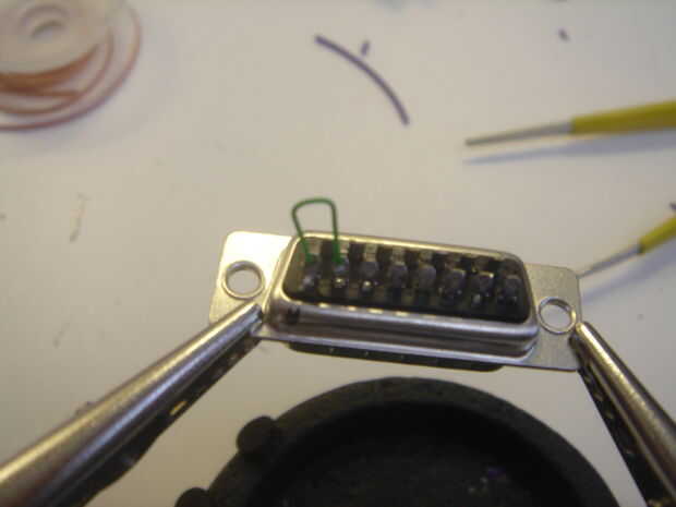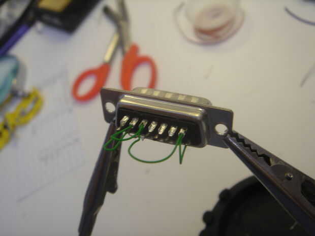 Para ello, vamos a encadenar un alambre de un perno a la siguiente. Utilizando piezas pequeñas (< 1") de alambre de calibre 30 con los extremos despojados, esto llega a ser bastante fácil en comparación con grandes cables. En la imagen podrás ver el primer tal conexión, del pin 1 (GND) al pin 2 (bajo). El siguiente es una pieza idéntica del pin 2 al pin 3 de la conexión de los cables, conectando otro pin 3 a pin 4 pin 4 y 5, pin 5 y 6 y por último pin 6 a 7.