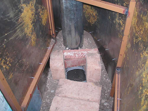 - Empezar por apilables ladrillos en cada lado del codo del tubo de la estufa y en la parte superior. El extremo del codo quiere exponerse, pero los ladrillos deben ser capaces de retener la arena que rodea a los tubos de la estufa como se levanta. Ladrillos de posición de una manera que no les permite pasar con peso detrás de ellos.