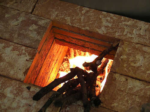 Llamas ni humo salen la parte superior de este cuadro, porque el proyecto de la canalización vertical del calor del fuego tira horizontalmente. Si hace humo vienen hacia fuera, empuja el material ardiente en la estufa un poco para calentar el tubo vertical y comenzar el proyecto.