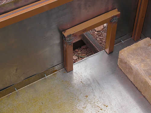 - También desea un marco alrededor de la abertura del cenicero. Nuestra apertura es 6 ½" de ancho por 7 ½" de alto, así que cortamos dos montantes en 7 ½" alto cada uno y una pieza horizontal, 8 ½" amplia, que sueldan con autógena sobre los montantes.