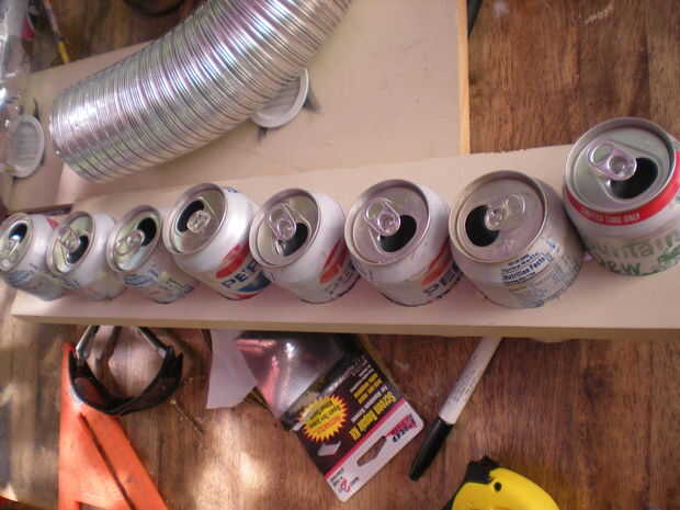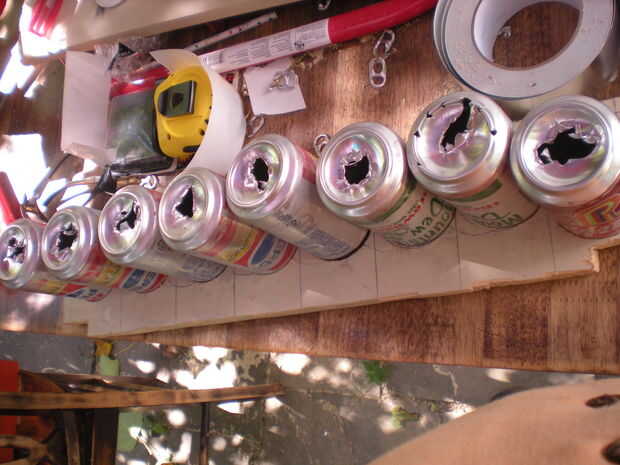 Una vez que las latas se lija, la matriz debe planificarse. Lugar latas de lado a lado a lo largo de la Junta Directiva del fondo, dejando un pequeño espacio entre cada uno pueden. Dibujar el contorno de las latas en el tablero inferior para hacer el primer colector. Proporcionar suficiente espacio de cada borde para asegurarse de que la Junta no se romperá cuando taladre los orificios de tamaño puede. Use la de 2 5/8 pulgada agujero broca. Use cinta de metal para reforzar las fronteras entre los agujeros de la lata como el taladro probablemente creará delgadas paredes entre cada uno puede agujero.