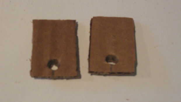 1) corte dos piezas que son 1 por 1 y 1/2 pulgadas de largo. Poke agujeros 1/4 de pulgada de la parte inferior y 1/2 pulgadas desde el lado.
