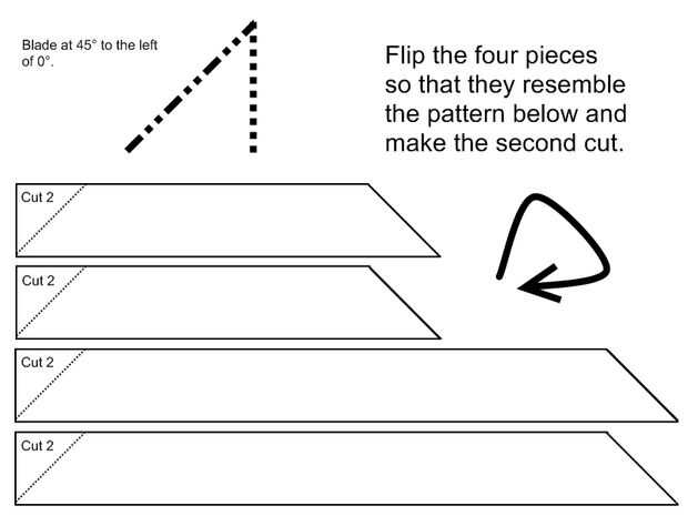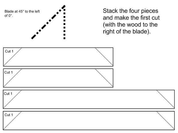 Para las piezas del marco superior, sin embargo, usted necesitará hacer cortes en ángulo. Dado que la estructura será un rectángulo, establecer su sierra para cortar ingletes para cortar ángulos de 45 grados (o 135 grados). Coloque las cuatro tablas todas en una pila y hacer un solo corte inclinado en un extremo de la pila. (Vea la gráfica abajo). Esto asegurará de que los ángulos son complementarios, una vez hayas terminado corte. (Por supuesto ya que todos los cortes deben ser a 45 grados, debe ser complementarias de forma predeterminada, pero en caso de que la sierra no es fiable al 100%, haciendo los cortes de esta manera se asegurará de que te encajan muy bien). Esto les hará mucho mejor que si se corta cada uno por separado.
