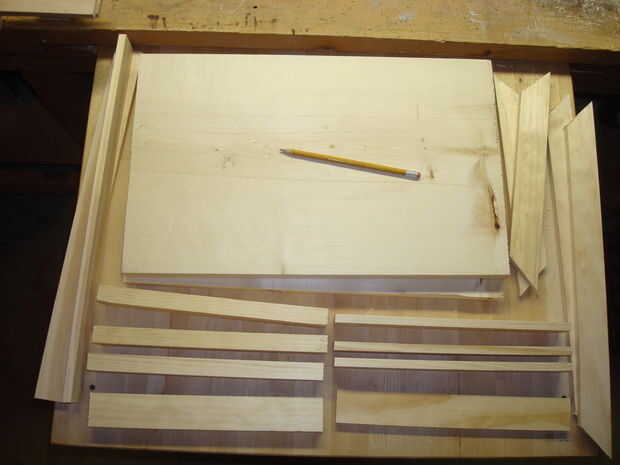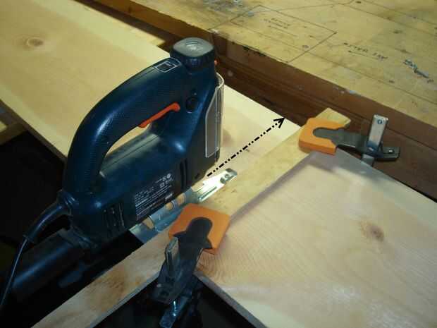 Cortar el panel de piso y la espalda con su sierra de ingletes o en tabla. Si estás usando una sierra de vaivén, se recomienda que sujete un borde recto para la madera para que la sierra caladora tiene que usar como guía. (Véase el cuadro a continuación para ver lo que estoy hablando aquí). Es muy difícil cortar una recta a mano alzada y tener el borde elimina la necesidad de tener que alisar más adelante con una escofina y papel de lija.