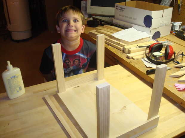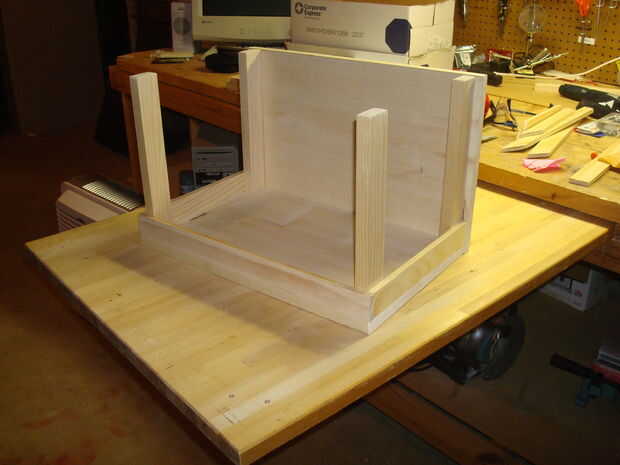 Antes de que se seque completamente, usted querrá pegar los cuatro soportes. Pega los vuelta dos soportes 3/8" desde el lado de la tabla de la base y lindan contra la parte trasera. Frente de la cola los dos soporta 3/8" de lado y 3/8" de la parte delantera de la tabla de la base. (Los soportes se compensan por el grosor de las tiras de encuadre).