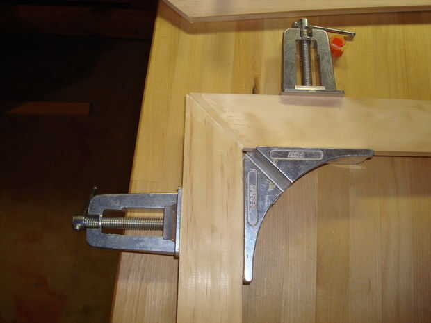 Para la parte superior del marco, puede pegar las piezas y esperar un cierre hermético o utilizar una abrazadera de marco la esquina (ver imagen). La desventaja de usar una abrazadera de la esquina es que necesitará esperar a que las piezas se sequen antes de pasar a la siguiente. Lo bueno es que vas a obtener un mejor vínculo y un marco general más fuerte.