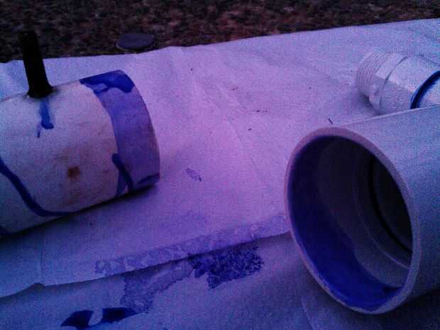 Cebe el interior de los otros 2" acoplamiento y el exterior de la cámara de aire de PVC de 2". Cuando se seca la imprimación, aplicar cemento para PVC hasta el lugar donde se el primer (puede tener una cantidad decente en esta ocasión, teniendo en cuenta esta es una de las más grandes piezas bajo presión) y conecte las dos partes.