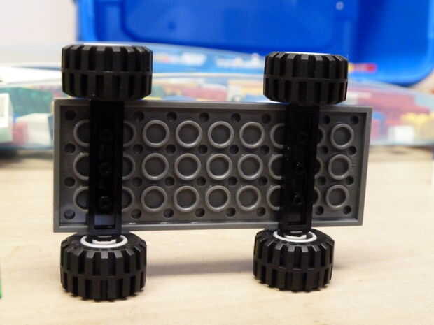 Colocar ruedas a LEGO plana gris grande. Frente es el lado con ruedas más cercanas hasta el final. (Lado izquierdo del cuadro)