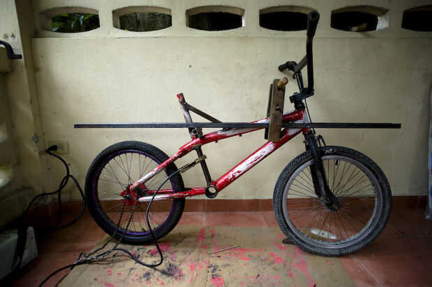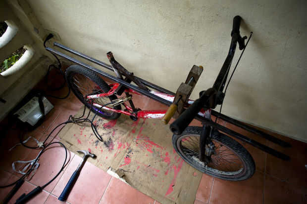 Cortar dos piezas de tubo a 56'' luego sujetarlos a los lados de la estructura de la bicicleta.