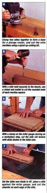 Extienda las mortajas de los largueros de la caja de la lateral de fijación a los montantes, entonces Marque a través de sus bordes (Foto 3). Utilizar un router de inmersión con un poco de corte hasta 1/2 pulgadas de diámetro y una guía de borde para cortar mortajas (foto 4). Abrazadera dos montantes juntos antes de enrutamiento para proporcionar una superficie estable para el router y corte la mortaja en dos o tres pasadas. Mientras tienes el router a, reajuste la profundidad de corte y corte las ranuras de panel en los bordes del montante. Reajustar el router otra vez para cortar las ranuras de panel en los rieles laterales y luego cortar los extremos de la Plaza de mortajas usando un cincel (Foto 5).