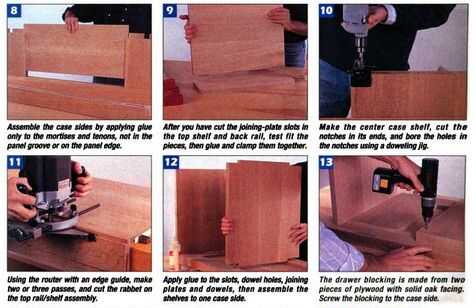Cortar las muescas en el estante medio, marque la posición de los orificios para taquetes estante y luego usar un jig espigado para agujerear los agujeros (foto 10). Cuando hayas completado esto, agujero que empareja los agujeros en los largueros de la caja de la lateral. Acabado de trazar las ranuras de la placa de Unión en el estante inferior y lados de caso, a continuación, corte las ranuras. Sujete una regla recta a los lados a la posición de la ensambladora. A continuación, utilice a la guía de router y borde para cortar el rebajo a lo largo del borde posterior de la Asamblea de carril/estante superior (foto 11) y a lo largo de los bordes posteriores de los costados de la cajas.