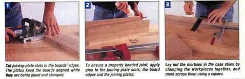 Sujete la ensambladora y la pieza de trabajo firmemente a la superficie de la mesa de trabajo y corte las ranuras (Foto 1). Unte el pegamento en las ranuras a lo largo de los bordes de los objetos y en las placas de unión (Foto 2). Coloque las placas y montar un panel. Sujete el panel para tensar las articulaciones, a continuación, compruebe que el panel es plano. A continuación, pegue encima de la población de 1⁄2 pulg. de espesor de los paneles laterales y puerta. No es una buena idea utilizar las placas de Unión para alinear las juntas de los paneles más delgados porque la Junta de la placa puede ser visible al finalizar el panel. Preparar el resto de las acciones para las partes del caso. RIP, de corte transversal y común a todas las partes a dimensión acabada, incluyendo los paneles previamente pegadas hacia arriba. Cada parte para indicar el lado de la cara y orientación en el caso de la etiqueta.