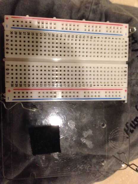 Comenzar con la protoboard. Puede utilizar Velcro u otro método para poner en la gorra de béisbol o una plataforma de montaje. (Se muestra en la foto) Si es así, asegúrese de que usted será capaz de eliminar más tarde cuando se construye el sombrero. Añadir Velcro a la plataforma de montaje o directamente a la gorra de béisbol para la batería.