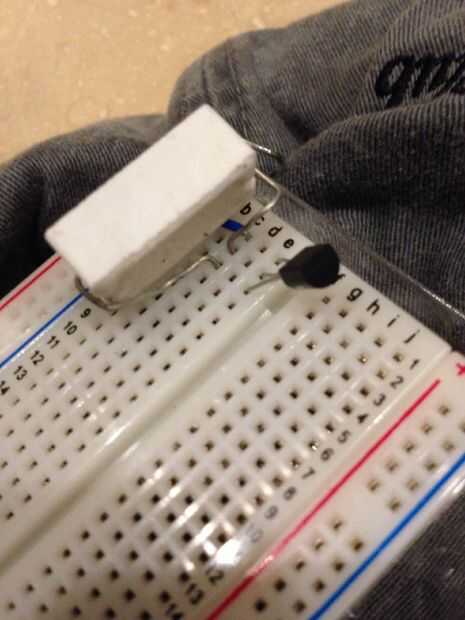 Agregar el regulador de voltaje LM334Z al circuito por lo que es en la orientación correcta, como se ve en la foto. Asegúrese de que el lado plano del regulador de voltaje se enfrenta a la resistencia.
