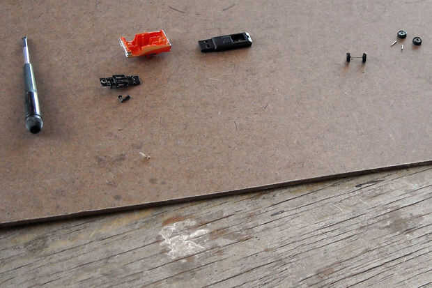 Algunos de los coches tienen tornillos y algunos de ellos tienen pernos o remaches. Que elegí tenía este último, así que sólo cuidadosamente apalancar el fondo apagado con un flathead destornillador.