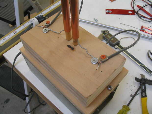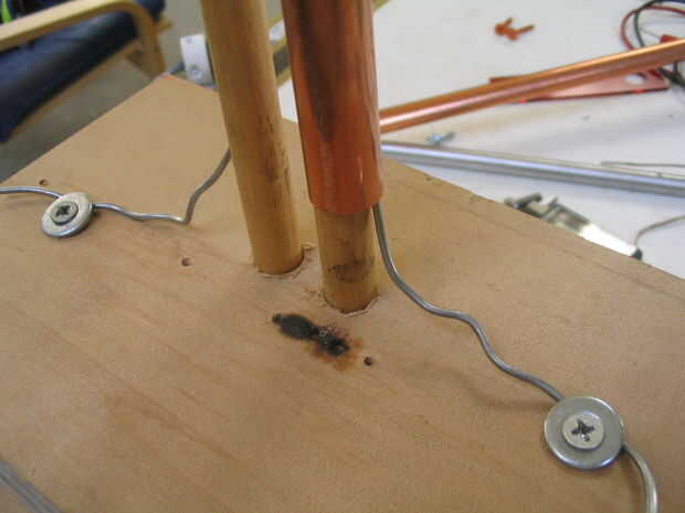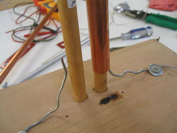 Montar dos tuberías de cobre en los tacos. Hacer el ajuste apretado un poco poniendo el cable entre la espiga y el tubo.
