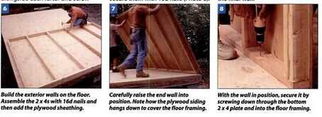 Levante la pared en su lugar (foto 7) y fije con tornillos de 3 pulgadas (Foto 8). Marco y levantar la pared posterior, seguida por la pared frontal. A continuación, instale la Tabiquería interior. Si estás incluyendo una sala de juegos, como lo hicimos, cubrir el lado de la partición que se enfrenta a esa habitación con madera contrachapada y atorníllelo en su lugar. Luego instale la pared final.