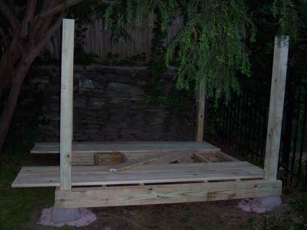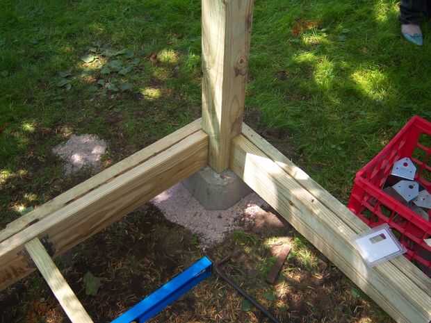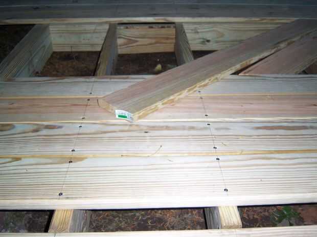 Los tableros de piso son estándar 5/4 x madera tratada a presión 6. En una cubierta, juntas normalmente será 3/16 espaciados "aparte pero estos coloqué un poco más. Este suelo tendrá un techo sobre él y las paredes en los cuatro lados para que drenaje de agua (de lluvia) no es un problema.